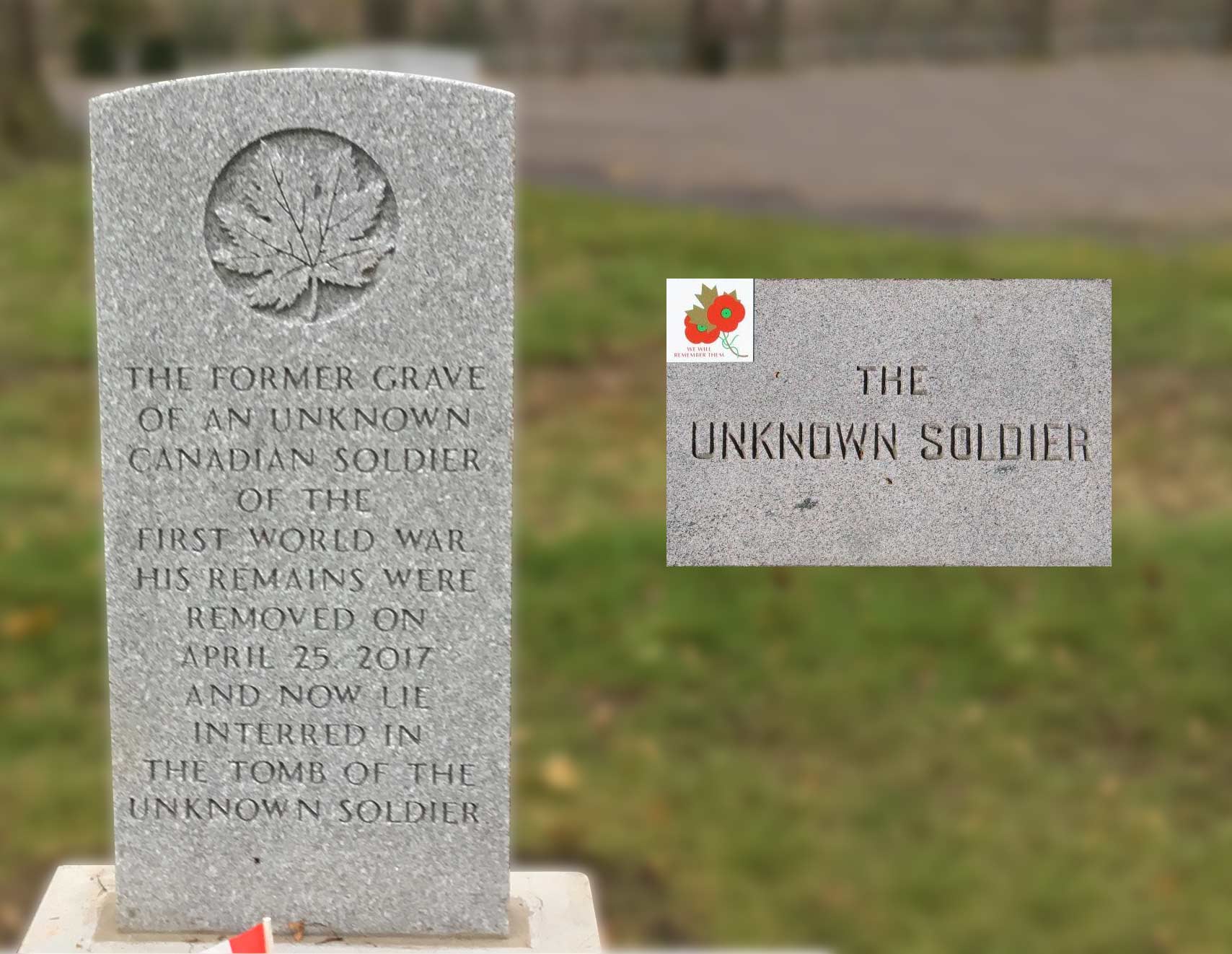 La Tombe du Soldat inconnu est un monument pour tous ceux qui ont donné leur vie et leurs services au nom de leur pays, sans reconnaissance ni souci pour leur propre sécurité. Le 16 septembre 2017, une cérémonie a reconnu comme il se doit le Soldat inconnu par des funérailles militaires officielles et une mise en terre. Le Soldat inconnu a été apporté au cimetière par la maison funéraire Morse and Son, transporté par un cheval et une voiture, et réinhumé dans la nouvelle tombe. Des représentants locaux des Forces armées canadiennes ont porté le cercueil.