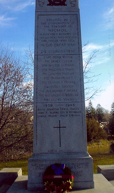Les résidents du canton de Nichol se sont réunis le 12 avril 1919 et ont discuté de la façon d’accueillir chez eux les soldats de retour de la Première Guerre mondiale et d’honorer ceux qui y étaient tombés. Le Soldiers Memorial Committee a été formé et ils ont retenu les services de la McIntosh Marble and Granite Company de Toronto qui a fourni un monument de granit de Stanstead gravé des noms de ceux tombés au combat. Au sommet du cénotaphe se trouve une feuille d’érable entourée d’une couronne, sertie de bronze.