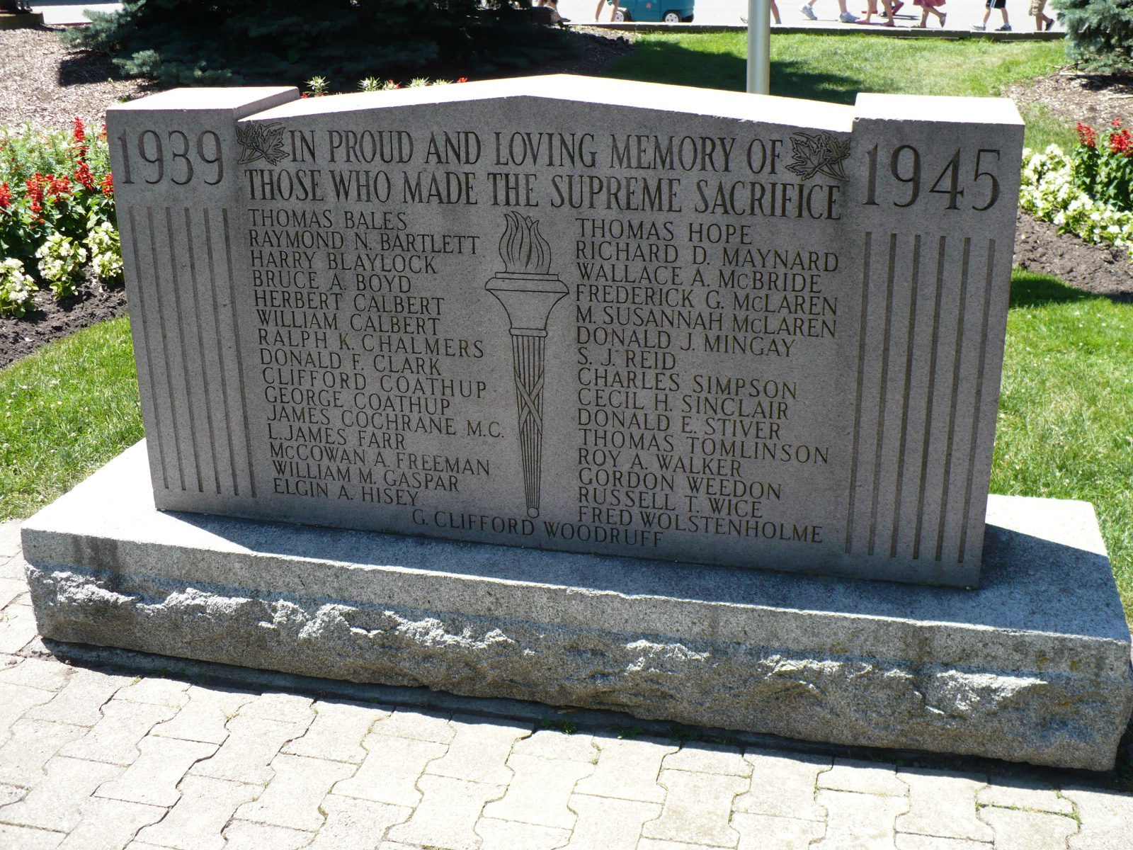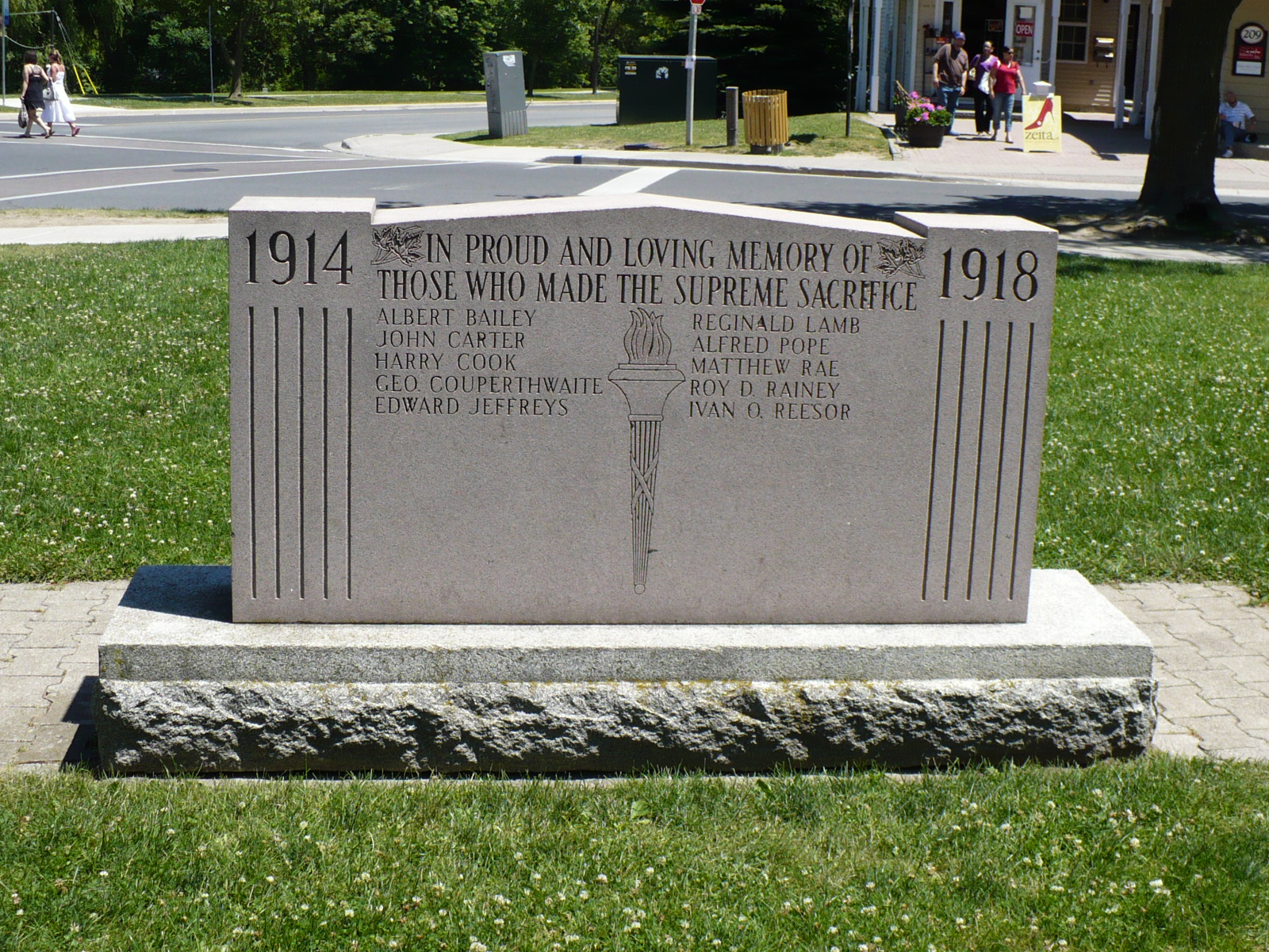 Ce mémorial est dédié à ceux qui ont fait l’ultime sacrifice pendant les Première et Seconde Guerres mondiales. Les recherches ont révélé qu’il a été construit juste avant 1950. Les plans relatifs à sa construction sont mentionnés dans un article du Markham Econ’s Sun publié le 27 février 1947, au sujet des dons reçus par les anciens combattants du canton.