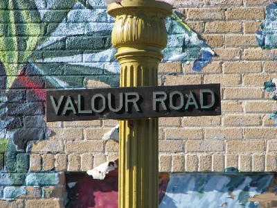 Cette rue, renommée après la Première Guerre mondiale, est un hommage aux trois récipiendaires locaux de la Croix de Victoria : le Cpl Leo Clark, le Sgt maj Frederick William Hall et le Lt Robert Shankland. Ces trois hommes vivaient sur la rue Pine, qui a été renommée « Valour Road ». La plaque a été créée par le Women's Canadian Club of Winnipeg en 1925.