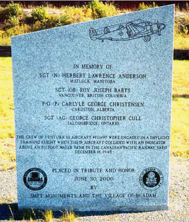Ce mémorial est dédié aux membres de l’équipage de l’avion Ventura III /FD697, qui ont péri le 18 décembre 1943. Il a été érigé par le Village de McAdam et la Smet Monuments le 30 juin 2000.