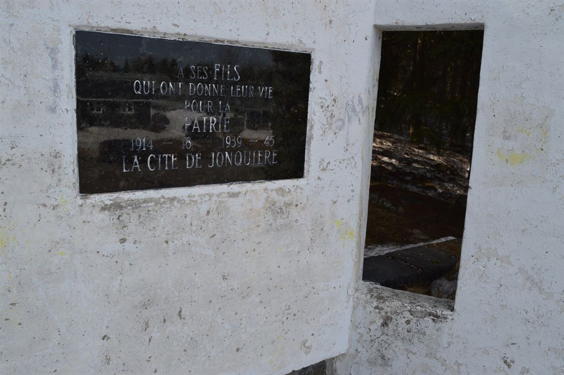 Érigé en 1964, le monument est composé de deux murs blancs en béton de différentes dimensions. Le plus petit porte la plaque d’identification en granit poli en son centre à 1,6 m du sol. Le plus grand des murs a été ajouré à la même hauteur que la plaque. Il porte dans la partie du haut une croix en acier peinte en noir qui a la forme d’une épée. De chaque côté il y a des murets en pierre. Le tout repose sur une estrade qui est elle aussi en pierre.