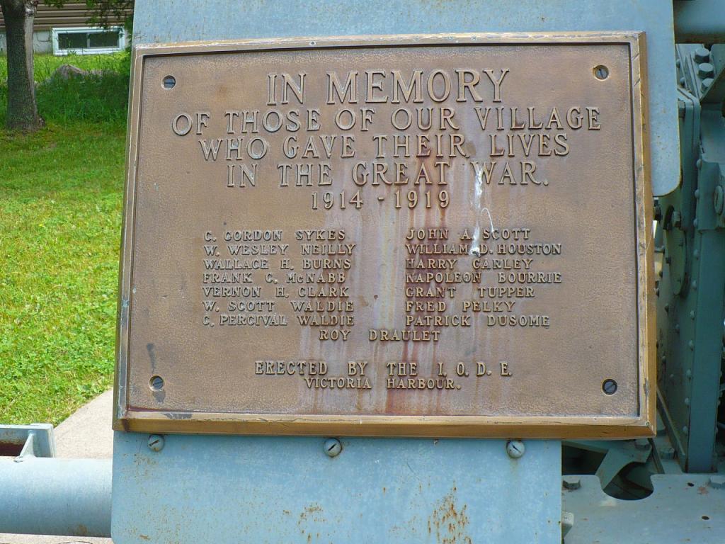 Ce mémorial est dédié aux résidents de Victoria Harbour qui ont servit pour leur pays. Le mur de pierre doté d’une grosse croix blanche fut érigé en 1967 par la filiale no 523 de la Légion royale canadienne. Un canon antiaérien commémoratif avec deux plaques sur lesquelles on retrouve les listes de noms des soldats de Victoria Harbour morts pendant les deux Guerres mondiales, se trouve à proximité.