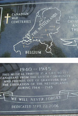 En 1944-1945, après avoir combattu tout au long de leur avance en Belgique, les forces alliées, qui comptent de nombreux soldats canadiens dans leurs rangs, libèrent les Pays-Bas. Plus de 60 ans plus tard, les Pays-Bas et les émigrants de ce pays un peu partout dans le monde n’ont pas oublié ce cadeau du Canada, lequel a perdu près de 8 000 soldats qui ont combattu pour la liberté des Néerlandais et dont les dépouilles reposent toujours en terre néerlandaise. Le 22 septembre 2006, ce monument commémoratif a été donné par la communauté néerlandaise en guise de remerciement au Canada et à ses forces armées pour le rôle qu’ils ont joué dans la libération de la Hollande et de la Belgique au cours de la Seconde guerre mondiale. Le monument a été présenté, au parc Victoria, aux anciens combattants canadiens de la Seconde guerre mondiale et particulièrement à ceux venant de la ville de London. Il comprend trois sections. La première est un carillon unique en son genre comprenant 18 cloches de bronze suspendues sur une grosse tour d’acier inoxydable. La deuxième consiste en une sculpture de granit à la base du carillon, qui montre les emplacements des cimetières des Forces canadiennes en Hollande et en Belgique, où se trouvent 7 600 tombes de soldats canadiens ayant participé à la Seconde Guerre mondiale. La troisième section, très typique des Néerlandais, est un beau jardin conçu de façon à englober tout le site.