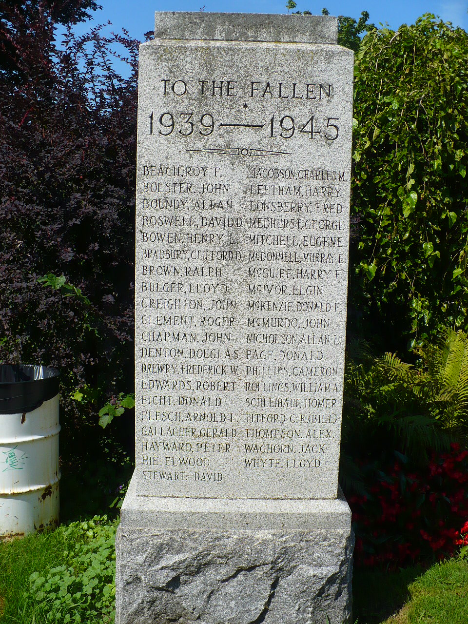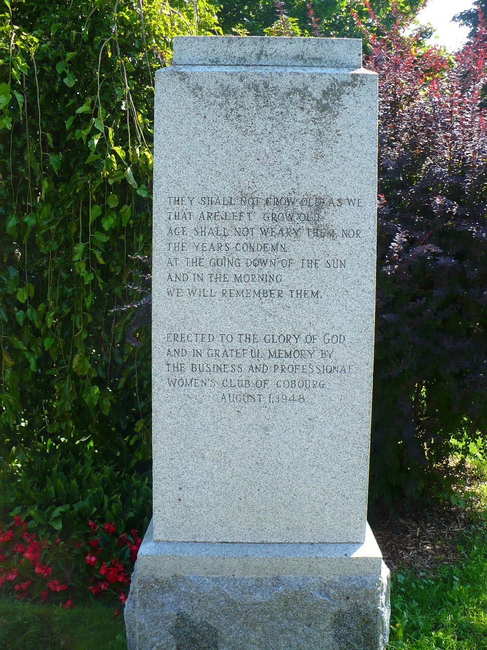 ERECTED TO THE GLORY OF GOD AND IN GRATEFUL MEMORY OF THE BUSINESS AND PROFESSIONAL BUSINESS CLUB OF COBOURG AUG 1ST 1948 AND THE NAMES OF THOSE COBOURG BOYS THAT DIED IN 1939 TO 1945