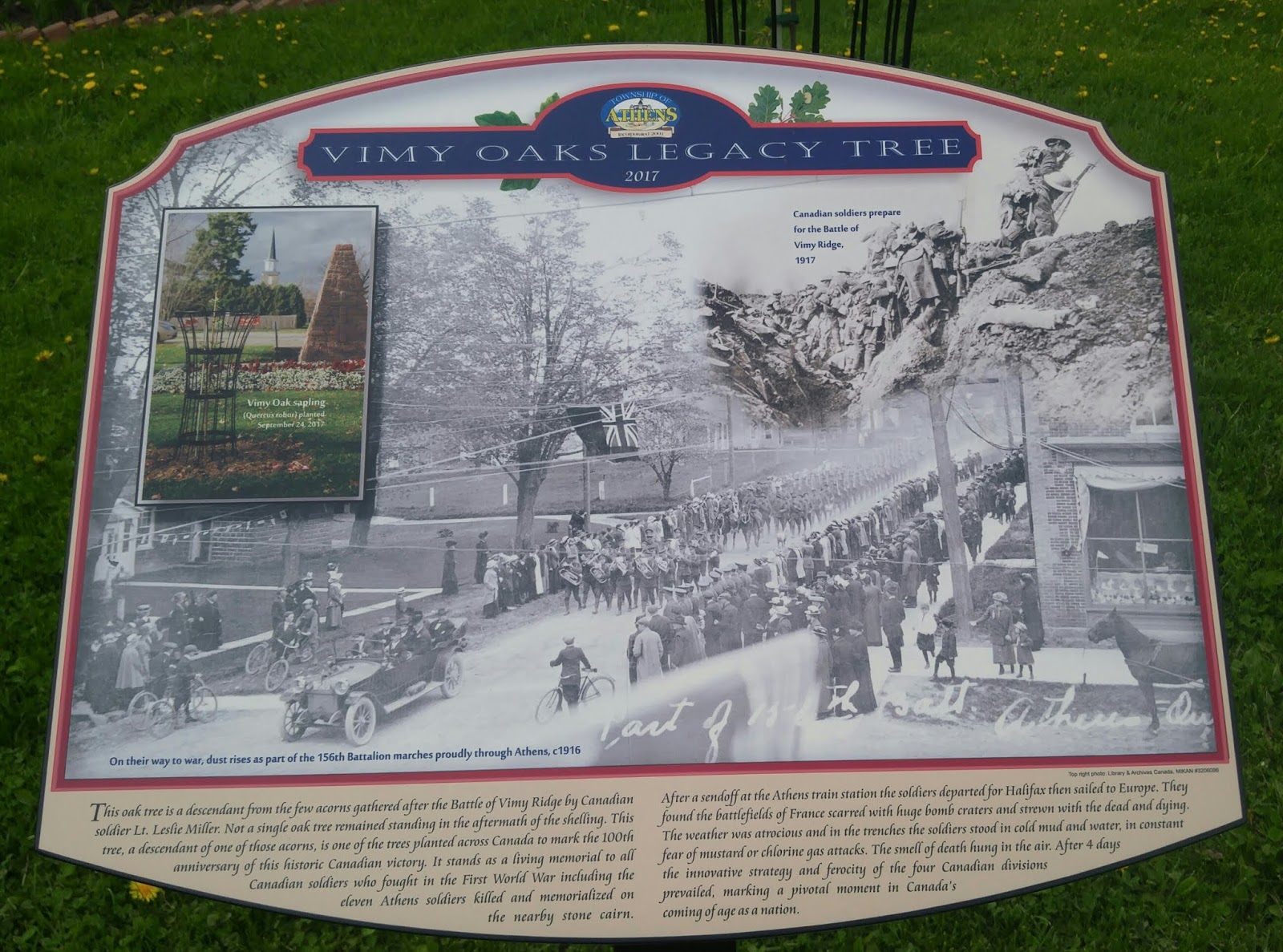 This oak tree is a descendant from the few acorns gathered after the Battle of Vimy Ridge by Canadian soldier Lt. Leslie Miller. Not a single oak tree remained standing in the aftermath of the shelling. This tree, a descendant of one of those acorns, is one of the trees planted across Canada to mark the 100th anniversary of this historic Canadian victory. It stands as a living memorial to all Canadian soldiers who fought in the First World War including the eleven Athens soldiers killed and memorialized on the nearby stone Cairn.