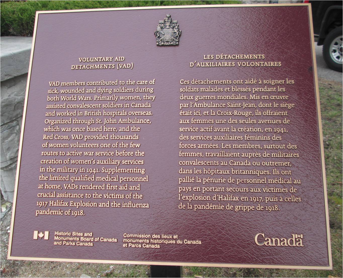 Bien qu’elles n’aient pas pu s’engager dans l’armée, plus de 2 000 bénévoles canadiennes ont trouvé une façon de servir leur patrie pendant la Première Guerre mondiale et à l’occasion de deux urgences nationales − l’explosion d’Halifax et la pandémie de grippe espagnole. Coordonnés par la Société canadienne de la Croix-Rouge et l’Ambulance Saint-Jean, les membres des DAV ont travaillé comme aides-infirmières, conductrices d’ambulance et commis de bureau dans des hôpitaux pour convalescents au Canada et dans certains hôpitaux à l’étranger. Elles prêtent main-forte au personnel médical et infirmier en prodiguant des soins aux milliers de militaires blessés et malades, certaines s’exposant aux mêmes épreuves et aux mêmes dangers que les soldats, les infirmières et les médecins qui se trouvent près de la ligne de front.