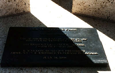 Un monument aux morts et une place de la paix, aménagés en 1987, se trouvent au centre des congrès d’Edmonton. L’Association des Anciens combattants de l’armée, de la marine et des forces aériennes au Canada a aménagé cette place commémorative comprenant des bornes de pierre en l’honneur des soldats, des marins et des aviateurs d’Edmonton et de la région qui ont perdu la vie pendant les Première et Seconde Guerres mondiales et la guerre de Corée. Le mémorial se compose notamment d’une enseigne marquant l’emplacement de la place de la paix, d’une flamme perpétuelle et de plaques commémoratives en bronze.