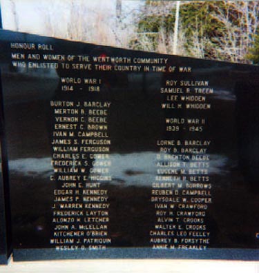 Ce mémorial est dédié aux combattants des Première et Seconde Guerres mondiales, de la guerre de Corée et de la guerre du Golfe. Il a été érigé par le conseil de développement communautaire de Wentworth comme projet du millénaire.