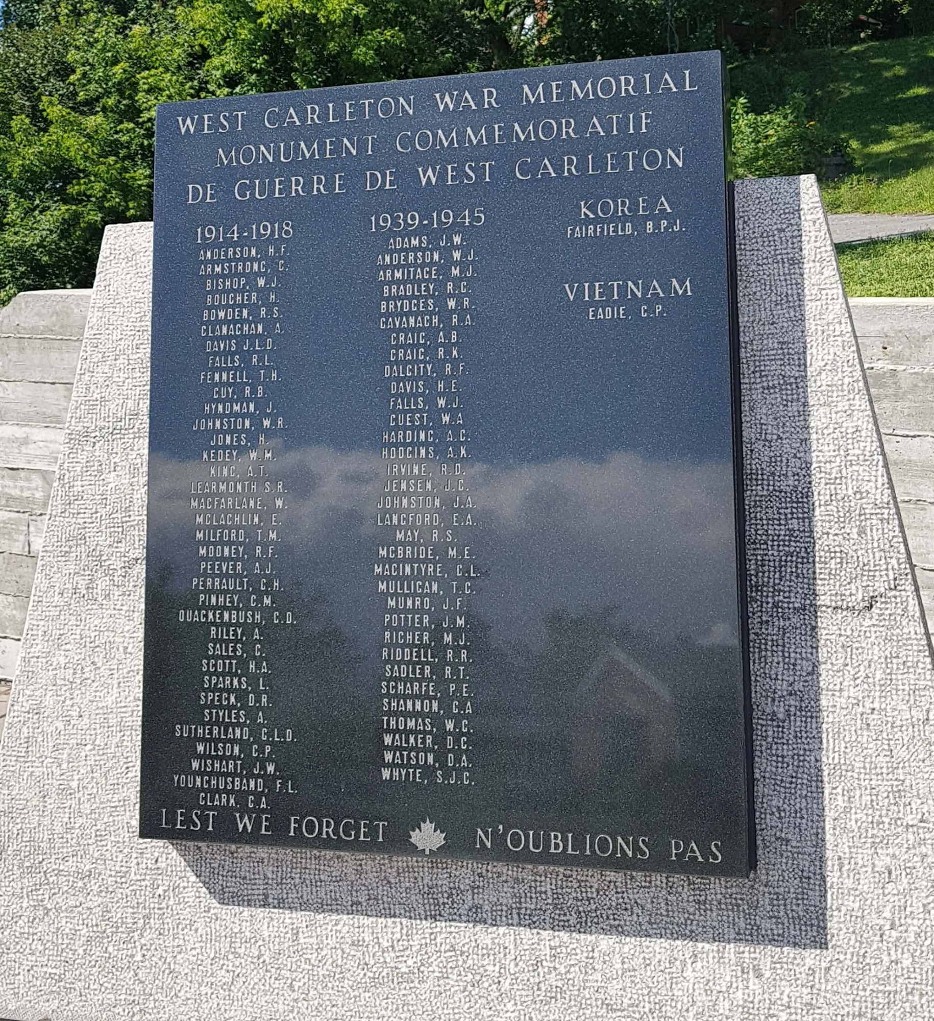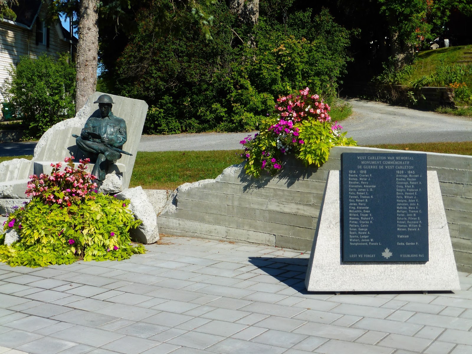 Au début de 2011, Stuart Hodge a entrepris de créer un cénotaphe qui sera situé à Carp et la Carp Business Improvement Area recevra un financement dans le cadre du Programme d’aide à l’édification de monuments commémoratifs dans les communautés. Le monument de guerre de West Carleton est composé d’une structure en granit noir surmontée d’une sculpture en bronze représentant un soldat assis, prenant une pause pour lire (et relire) une lettre de sa famille, au milieu du chaos et des décombres de la guerre. La sculpture est l’œuvre de Ron Cowle, tandis que la conception du cénotaphe a été confiée à la firme d’architectes Vanderberg & Wilderboer.