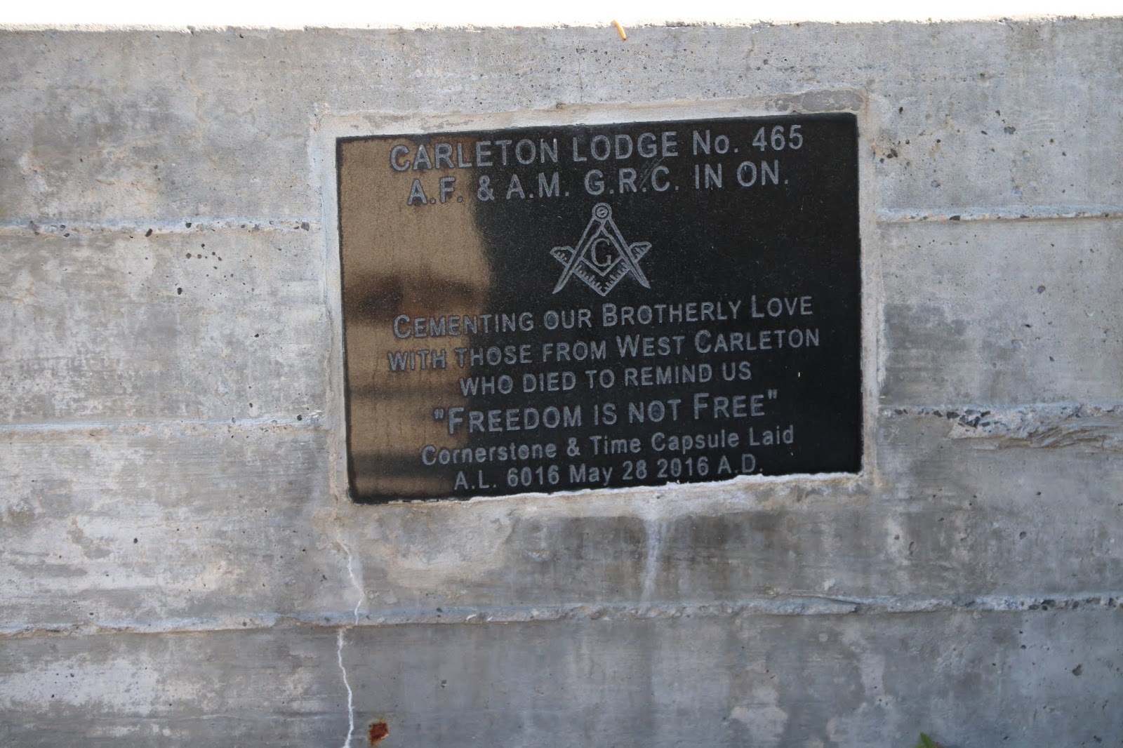 Le 28 mai 2016, la Loge maçonnique No 465 de Carleton a posé la pierre angulaire du nouveau monument de guerre du comté de Carleton, une ancienne cérémonie qui remonte au Moyen Âge. Donald H. Mumby, ancien Grand Maître de la Grande Loge du Canada en Ontario, a dirigé la cérémonie en déposant des outils anciens – l’équerre, le niveau et le niveau à plomb – pour s’assurer que la pierre était bien posée. Plus de 60 maçons venus des communautés suivantes étaient présents : Carleton, Kanata, Orléans, Smiths Falls, Ottawa, Arnprior et Aylmer.