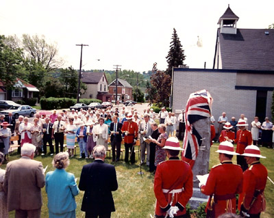 The young men of West Hamilton who gave their lives in World War II (1939-1945) were honoured at "West Hamilton's 80th Birthday Reunion." A memorial stone inscribed with their names was added to the cenotaph and officially dedicated on June 12, 1988 by Reverend Canon Eric Mills of St. Margaret's Church. Representatives of local militia units participated along with the public.
