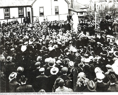 The Village of West Hamilton began in 1908. It had its own stores, a bank, a post office and numerous athletic and social organizations. World War I (1914-1918) had a significant effect on the young village. From a community of about 250 families, over 180 men served in the armed forces. Following the war, a Memorial Committee of veterans and delegates from churches, the Women's Institute, and social clubs raised funds to provide a memorial for the young men killed in the conflict.