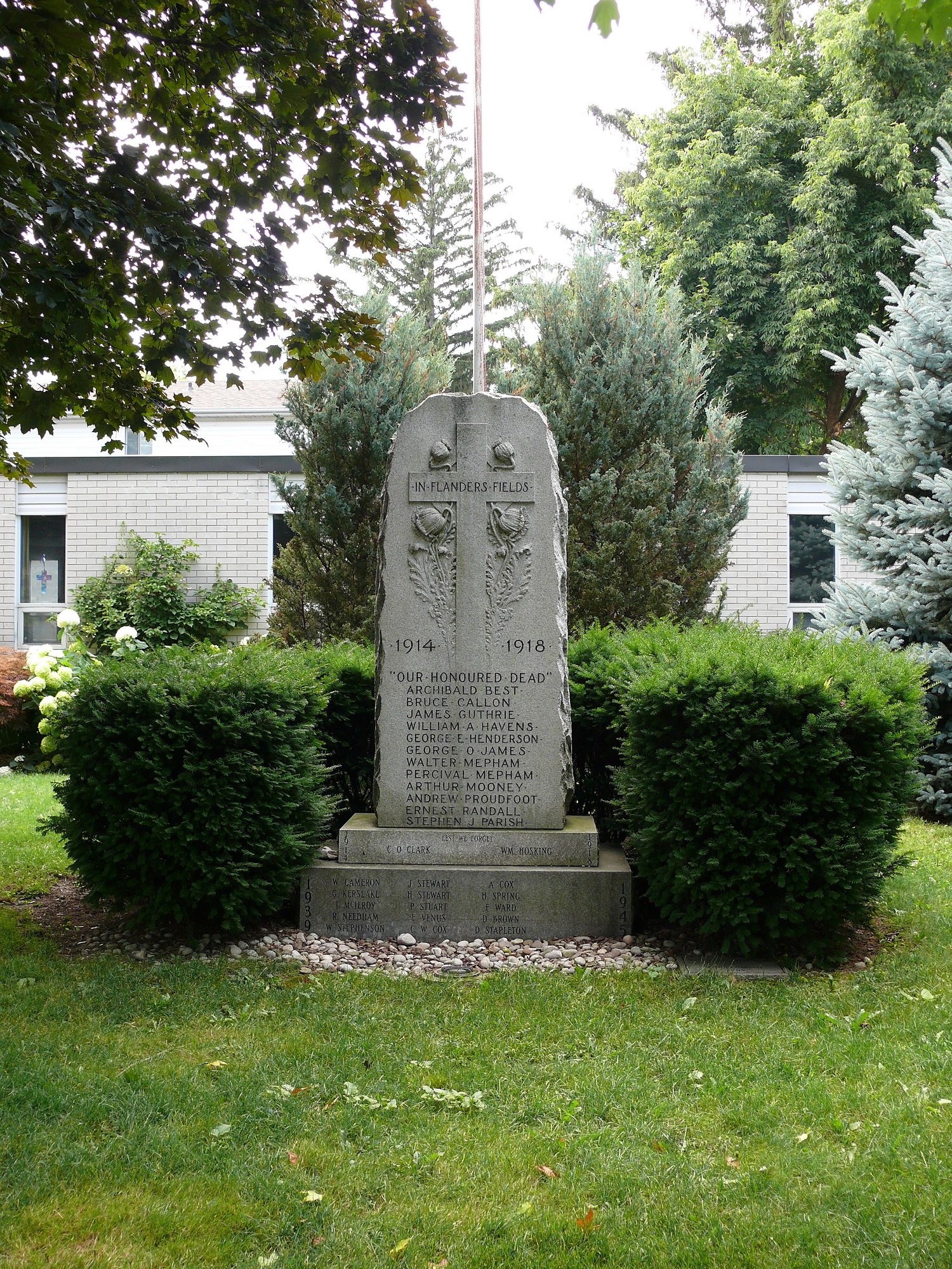 This fine granite cenotaph was unveiled in 1925 in a sunken garden alongside St. Margaret's Anglican Church, which later became St. George's. It depicts a cross with the title of the poem "In Flanders Fields" along with poppies as a symbol of remembrance.