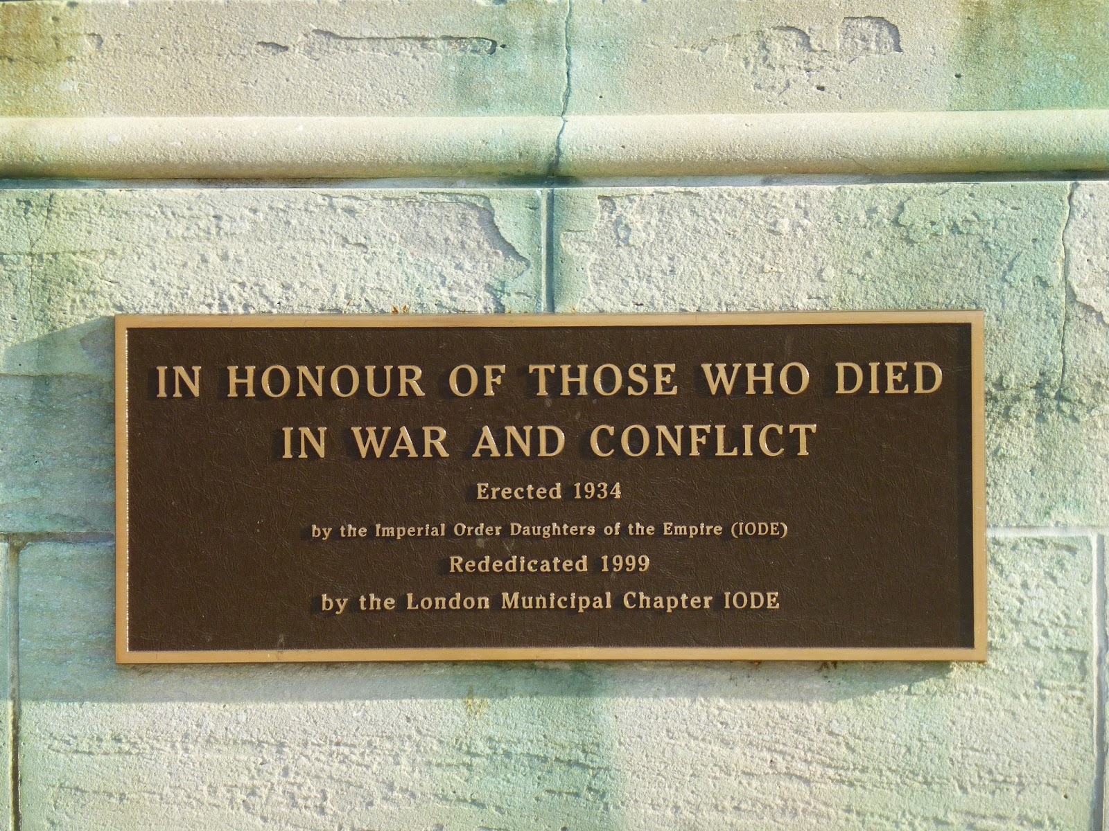 Jusqu’en 1933, le cénotaphe était une réplique temporaire en bois érigée chaque année au centre de la rue Dundas. Le 10 novembre 1934, le mémorial de calcaire a été inauguré dans le coin sud-est du parc Victoria. Des centaines de citoyens de London et des environs, des anciens combattants, des miliciens et des membres de l’Armée permanente étaient présents pour ce service impressionnant. La musique du Régiment royal du Canada, le plus ancien régiment de l’Armée permanente au Canada, a fourni l’accompagnement musical en compagnie de la chorale de la cathédrale St. Paul.