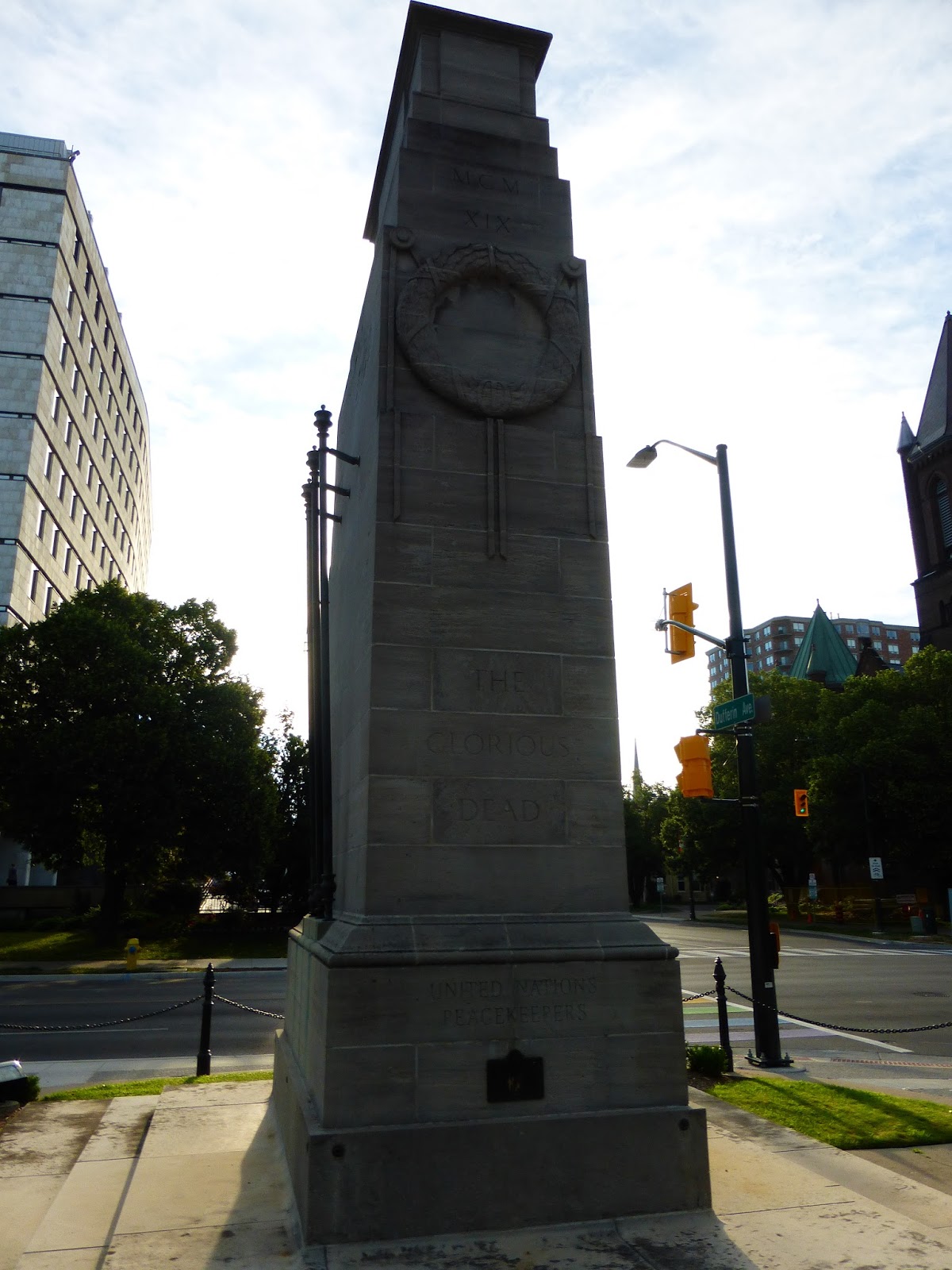 Le cénotaphe de Whitehall a été érigé à la mémoire de ceux qui ont perdu la vie pendant le Première et Guerres mondiale. L’Ordre impérial des filles de l’Empire a commencé à travailler à la construction d’un cénotaphe en avril 1925, invitant 50 organismes et sociétés à se joindre à lui. Un comité permanent du cénotaphe a été formé le 12 février 1934. Un legs de 1921 de la succession de S. Notley, pour un mémorial dans le parc Victoria à la mémoire des Canadiens tombés au combat, a été affecté au financement. Ce plan consistait à ériger une réplique du cénotaphe de Withehall, à Londres, mais en version plus modeste. Les plans ont été achetés en 1929 de sir Edward Lutyens, l’architecte du cénotaphe de Whitehall.