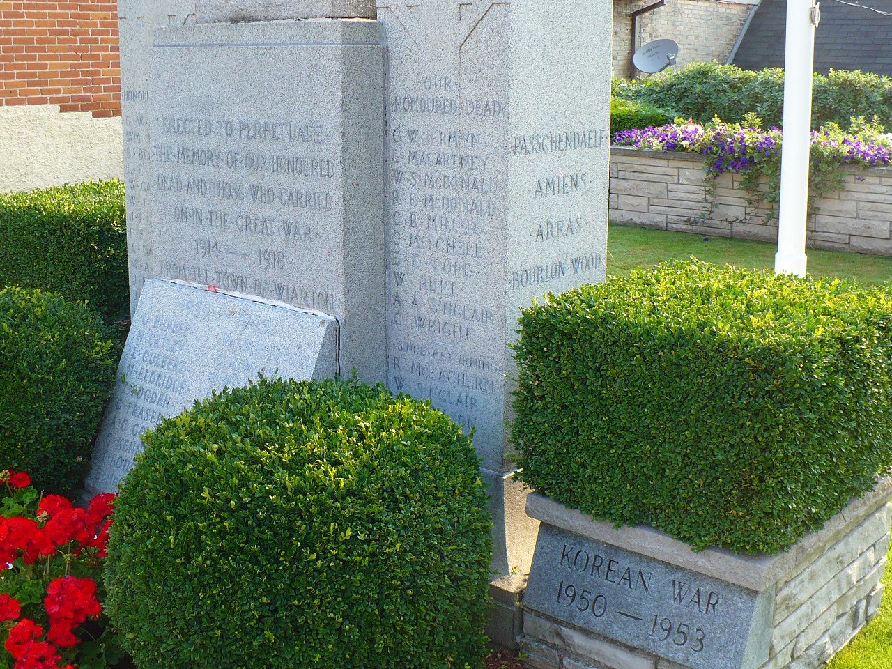 Le cénotaphe de Wiarton a été dévoilé en 1922. Le calcaire du monument a été envoyé d’Angleterre. Le cénotaphe représente un soldat de la Première Guerre mondiale debout et tenant son fusil devant lui. L’entreprise J. S. Cook & Sons of Wiarton a travaillé à l’érection du monument au coût de 3 000 $. Les noms des personnes tuées au cours de la Première Guerre mondiale ont été gravés dans la pierre. Les noms des personnes qui ont perdu la vie au cours de la Seconde Guerre mondiale ont été ajoutés plus tard. Des dates ont été ajoutées pour la guerre de Corée et des Casques bleus ont été reconnus sur l’inscription.