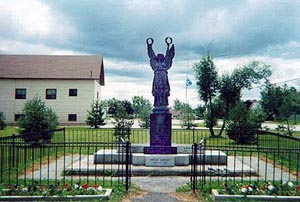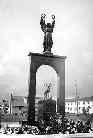 Ce monument commémoratif, érigé à l'origine en 1962, a été vandalisé en 1963 ou 1964. On a construit le monument actuel en 1964 ou 1965 en utilisant des morceaux de l'ancien monument. À ce moment, la guerre de Corée a été ajoutée et les plaques à gauche et à droite ont été modifiées de sorte qu'on puisse y lire World War I 1914 – 1918 (Première Guerre mondiale 1914 -1918) et World War II 1939-1945 (Seconde Guerre mondiale 1939 – 1945) respectivement. Le monument original était de 18 pieds et 10 pouces. Il comprenait une arche, une reproduction de la Victoire ailée, qui faisait sept pieds et deux pouces, et un caribou en bronze sur un piédestal de trois pieds. Sur l'arche, on pouvait voir l'emblème de l'Armée de terre, celui de l'Aviation, le Flambeau et l'emblème floral de Terre-Neuve, la sarracénie pourpre. Il avait été érigé par la Muir’s Marble Works, de St. John’s, et les statues avaient été importées d'Italie.