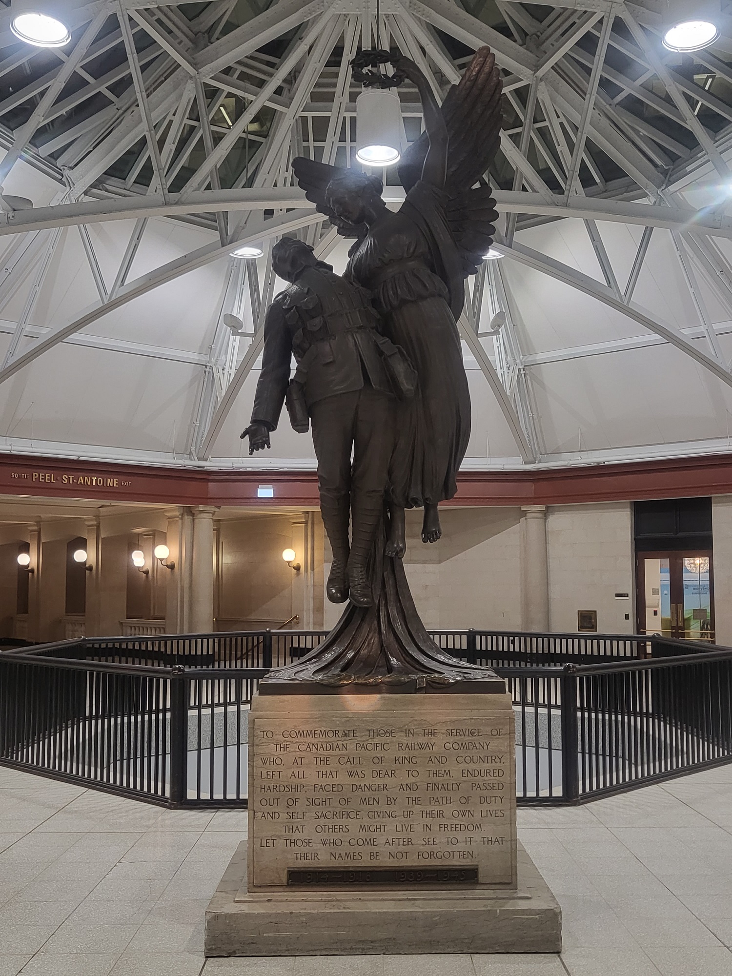 Pour commémorer les 1 116 employés qu’il a perdus au cours de la Première Guerre mondiale, le Chemin de fer Canadien Pacifique commande trois statues de L’Ange de la Victoire au sculpteur montréalais Cœur de Lion MacCarthy. Les trois statues sont dévoilées simultanément à la même date. La statue représente un ange portant au ciel un soldat décédé au moment de sa mort. L’ange tenait dans sa main levée une couronne de laurier, symbole de la victoire. Les deux autres mémoriaux identiques se trouvent à Manitoba et à Vancouver.