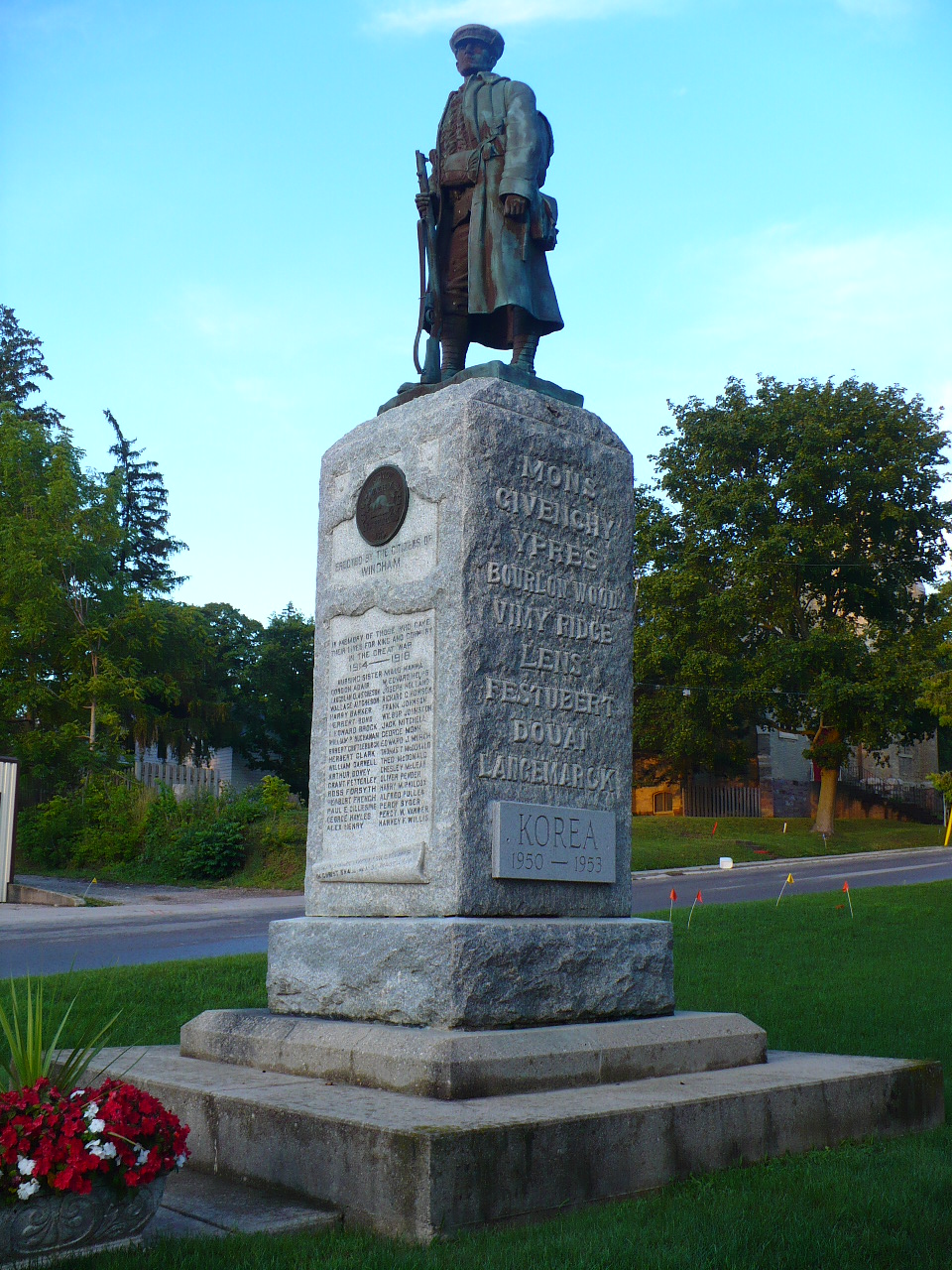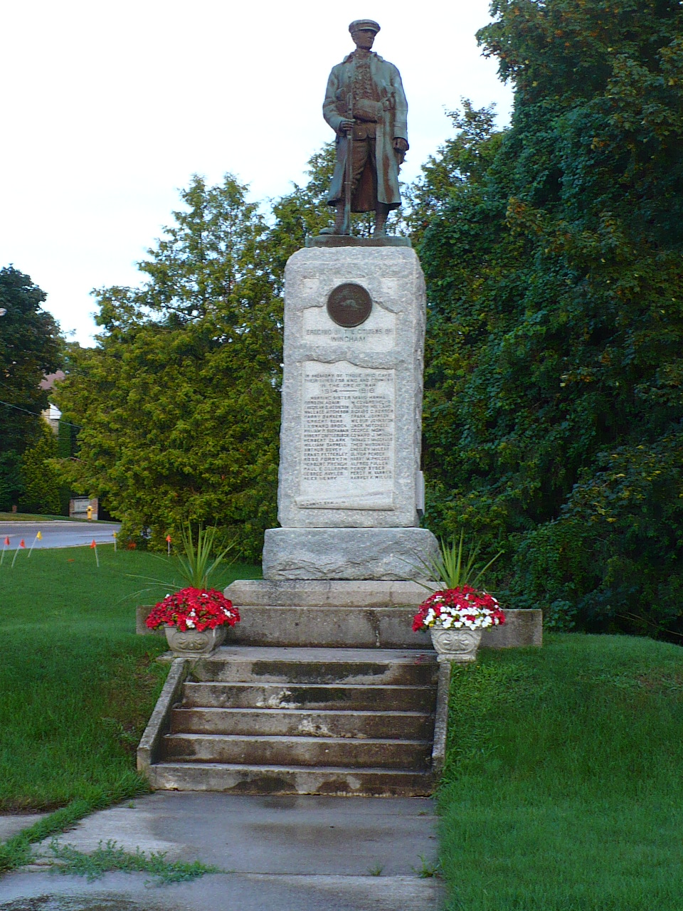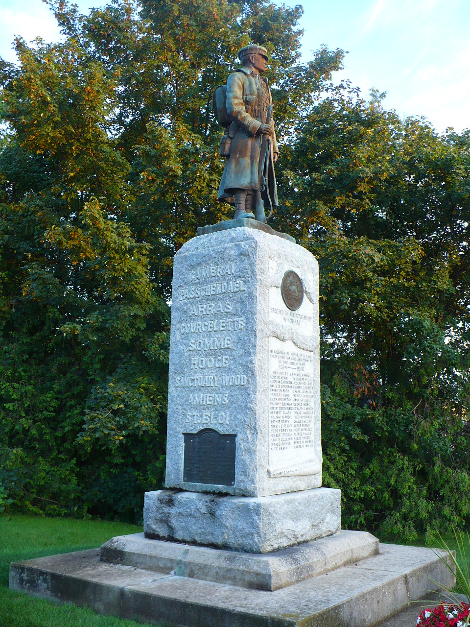 Première Guerre mondiale Maud Hanna - Sœur infirmière, SSAC, décédée le 6 septembre 1921 après une longue maladie, inhumée au cimetière de Wingham. Gordan Adair - 161e bn (Huron), décédé accidentellement en Angleterre le 22 novembre 1917, inhumé au cimetière militaire Hants 2, cimetière paroissial de Bramshott (St. Mary). Laughlan Aitchison - 1er bon, 1re bde, 1re division canadienne, Corps expéditionnaire canadien, décédé des suites de blessures le 10 juillet 1915, inhumé au cimetière St. Lawrence, Ramsgate, Angleterre. Wallace Aitchison - 38e bon, 4e bde, 4e division canadienne, Corps expéditionnaire canadien, décédé des suites de blessures le 11 avril 1917, inhumé au cimetière militaire de Bruay, France. Frère de Laughlan Aitchison. Harry Barker - 58e bon, 9e bde, 3e division canadienne, Corps expéditionnaire canadien, tué au combat le 26 octobre 1917, inscrit au Mémorial de la Porte de Menin, Ypres, Belgique. Herbert Bond - 5e bon canadien de fusiliers à cheval, 8e bde, 3e division canadienne, Corps expéditionnaire canadien, décédé des suites de blessures le 6 novembre 1918, inhumé au cimetière britannique d’Auberchicourt, France. Leonard Brock - 50e bon (régiment de l’Alberta), 10e bde, 4e division canadienne, Corps expéditionnaire canadien, tué au combat le 9 juin 1916, inhumé au cimetière militaire d’Adanac, Miraumont-Pys, France. William Buchanan - 75e bon, 11e bde, 4e division canadienne, Corps expéditionnaire canadien, tué au combat le 8 juin 1917, inhumé au Monument commémoratif de Vimy, France. Robert Chettleburg - 1er bon, 1re bde, 1re division canadienne, Corps expéditionnaire canadien, décédé des suites de blessures le 6 octobre 1918, inhumé au cimetière militaire de Terlincthun, France. Herbert Clark - 47e bon (Western Ontario Regiment), 4e division canadienne, Corps expéditionnaire canadien, tué au combat le 2 septembre 1918, inhumé au Monument commémoratif de Vimy, France. William Darnell - 4e bon (Central Ontario), 1re bde, 1re division canadienne, Corps expéditionnaire canadien, tué au combat le 29 décembre 1915, inhumé au cimetière militaire de Saint-Quentin Cabaret, Belgique. Arthur Dovey - 1er bon Essex Regiment, 37e division, Armée britannique, tué au combat le 1er février 1918, inhumé au cimetière d’Oxford Road, Belgique. Grant Fetterlet - 18e bon, 4e bde, 2e division canadienne, Corps expéditionnaire canadien, décédé en Angleterre le 19 février 1919, inhumé au cimetière paroissial de Bramshott (St. Mary), Hampshire, Angleterre. Ross Forsyth - 58e bon, 9e bde, 3e division canadienne, Corps expéditionnaire canadien, décédé des suites de blessures le 6 juin 1917, inhumé au cimetière militaire d’Etaples, France. Herbert French - 1er bon, 1re bde, 1re division canadienne, Corps expéditionnaire canadien, décédé en Angleterre le 24 décembre 1914, inhumé au cimetière de l’église de Bulford, Angleterre. Paul Gillespie - 9e ambulance canadienne de campagne, SSAC, tué au combat le 7 septembre 1918, inhumé au cimetière du Fauboug d'Amiens, Arras, France. George Hayles - 58e bon, 9e bde, 3e division canadienne, Corps expéditionnaire canadien, décédé des suites de blessures le 26 juin 1917, inhumé au cimetière militaire de Lapugnoy, France. Alex Henry - 1er bon, 1re bde, 1re division canadienne, Corps expéditionnaire canadien, tué au combat le 6 novembre 1917, inscrit au registre du Mémorial de la Porte de Menin, Ypres, contenant les noms des militaires tombés dans les Flandres et sans sépulture connue. Edward Helps - 18e bon, 4e bde, 2e division canadienne, Corps expéditionnaire canadien, tué au combat le 13 mars 1917, sans sépulture connue. Joseph Holland - 1er bon, 1re bde, 1re division canadienne, Corps expéditionnaire canadien, tué au combat le 3 septembre 1916, inhumé au Monument commémoratif de Vimy, France. Richard Howson - 116e bon, 3e division canadienne, Corps expéditionnaire canadien, tué au combat le 22 août 1917, inhumé au cimetière du Commonwealth d’Aix-Noulette, France. Frank Johnson - 47e bon, 4e division canadienne, Corps expéditionnaire canadien, tué au combat le 10 août 1918, inhumé au CHYD.EXT de Warvillers, France. Wilbur Johnson - 2e brigade, Artillerie canadienne de campagne, 1re division canadienne, Corps expéditionnaire canadien, décédé en Angleterre le 29 janvier 1918, inhumé au cimetière de Bath (Locksbrook), Somerset, Angleterre. Jack Mitchell - 46e bon, 10e bde, 4e division canadienne, Corps expéditionnaire canadien, décédé dans un accident d’avion en Angleterre le 24 janvier 1919, inhumé au cimetière paroissial de Throwley (St. Michaels), Kent, Angleterre. George Monk - The Royal Canadian Regiment, 3e division canadienne, Corps expéditionnaire canadien, tué au combat le 9 avril 1917, inhumé au Monument commémoratif de Vimy, France. Edward Murch - 1er bon, 1re bde, 1re division canadienne, Corps expéditionnaire canadien, décédé des suites de blessures le 28 avril 1917, Boulogne, France. Thomas McDonald - 58e bon, 3e division canadienne, Corps expéditionnaire canadien, tué au combat le 13 novembre 1917, inscrit au Mémorial de la Porte de Menin, Ypres, Belgique. Theo McDonald - 58e bon, 3e division canadienne, Corps expéditionnaire canadien, tué au combat le 15 juin 1917, inhumé au cimetière britannique de Vimy, France. Chesley McLean - Royal Flying Corps (prédécesseur de la R.A.F.), décédé à l’entraînement en Angleterre le 16 août 1918, son avion s’étant écrasé en mer du Nord; son nom est inscrit au mémorial du cimetière de Hollybrook, Southampton, Angleterre. Oliver Pender - 5e batterie de siège canadienne, 2e bde, Artillerie de garnison canadienne comme troupe de corps, décédé des suites de blessures le 21 avril 1917, inhumé au cimetière de Villers Station, France. Harry Philcox - 1er bon, 1re division canadienne, Corps expéditionnaire canadien, décédé des suit