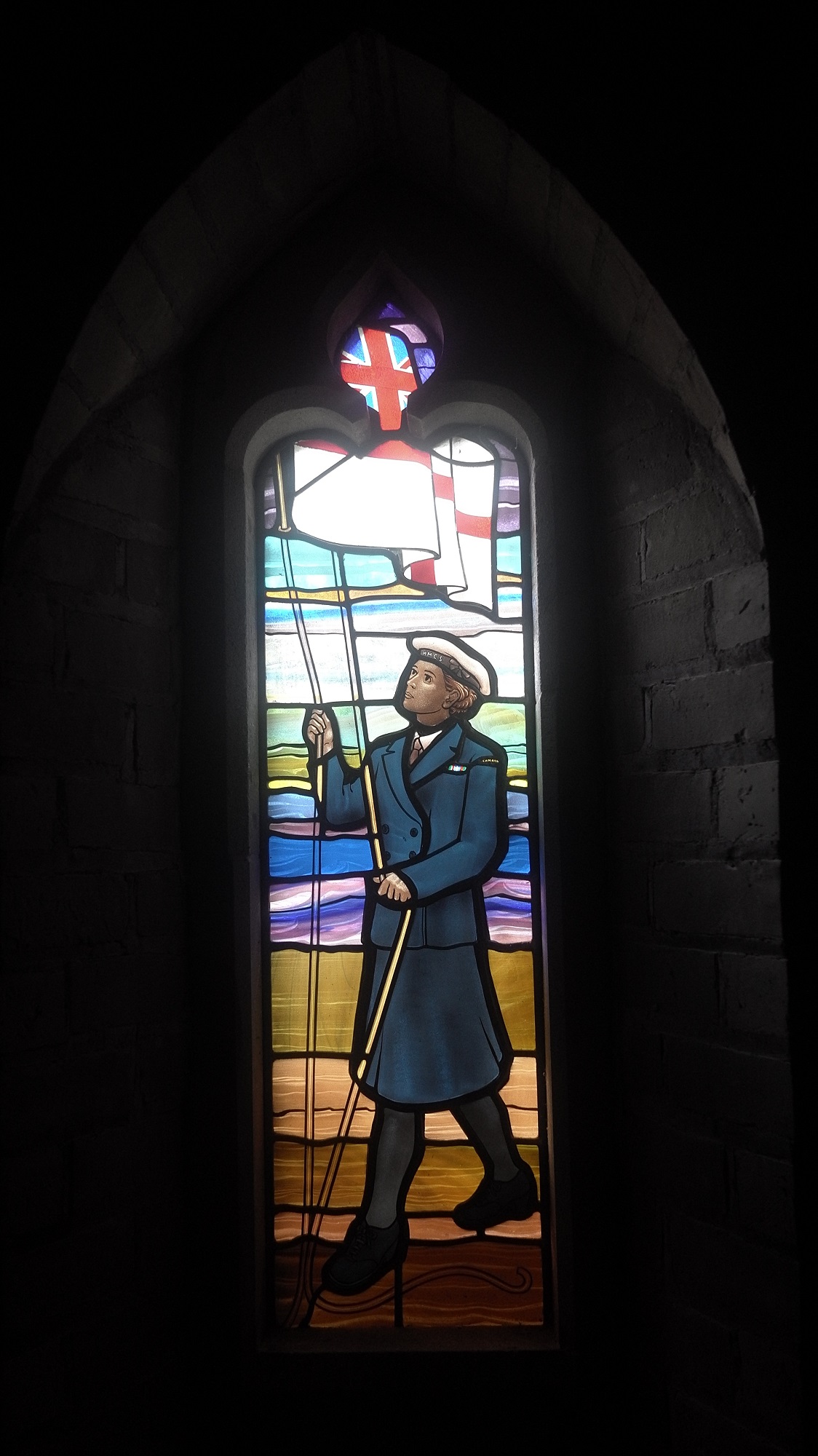 Les trois vitraux situés le long de la première volée d’escaliers, sur le mur nord, commémorent le service des femmes pendant la Seconde Guerre mondiale : le Service féminin de la Marine royale du Canada (SFMRC), communément appelé Wrens, le Service féminin de l’Armée canadienne et l’Aviation royale du Canada (Division féminine).