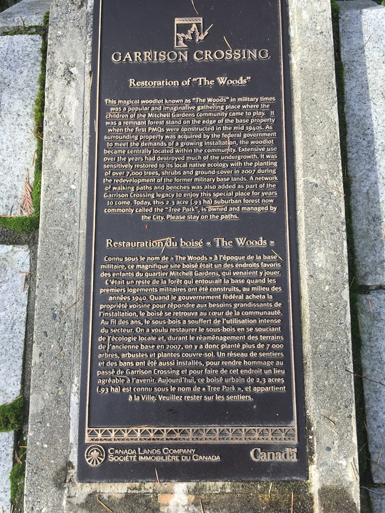 La Plaque commemorative du boisé « The Woods » et la Plaque de restauration du boisé « The Woods » fait partie de la promenade du Souvenir de Garrison Crossing.