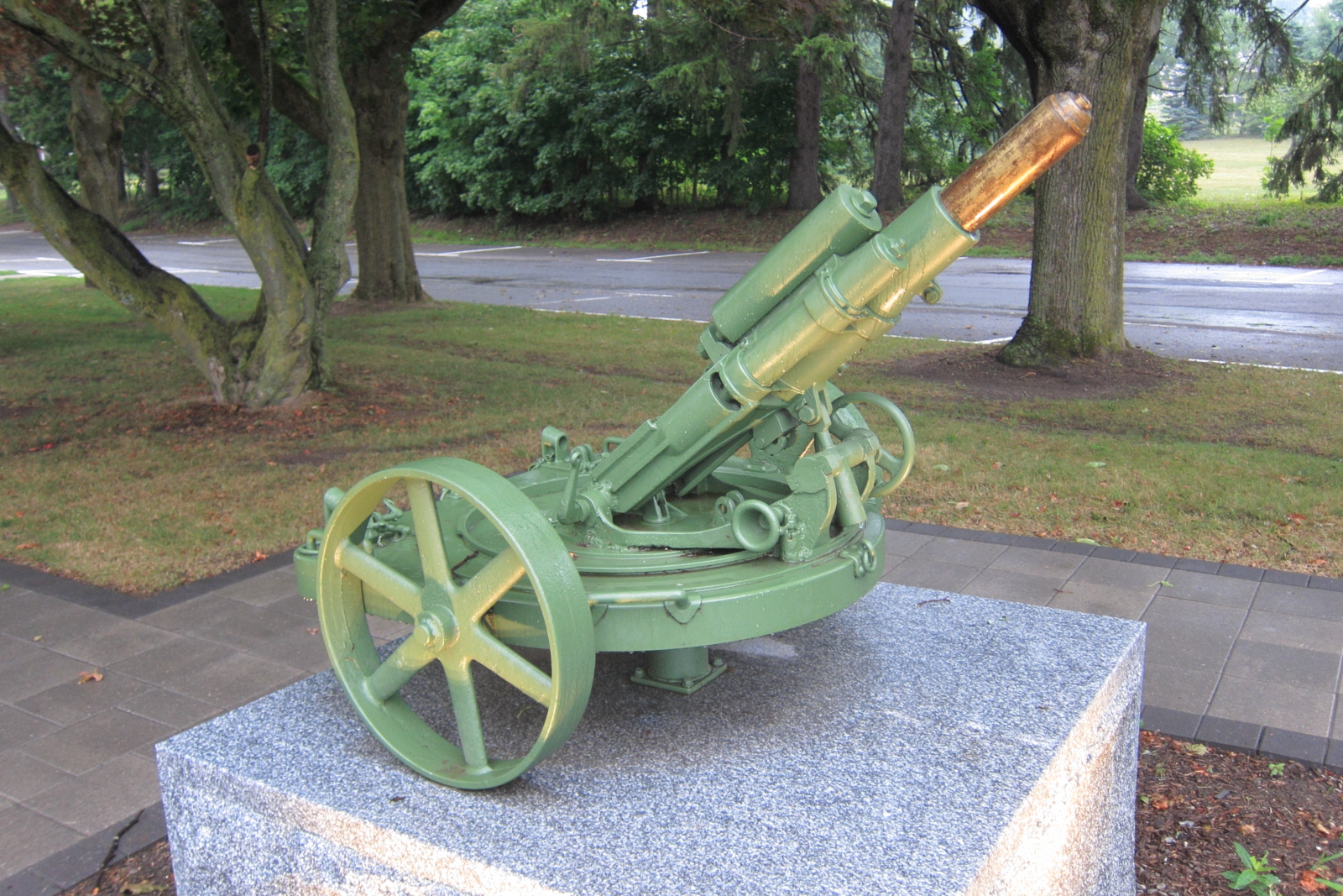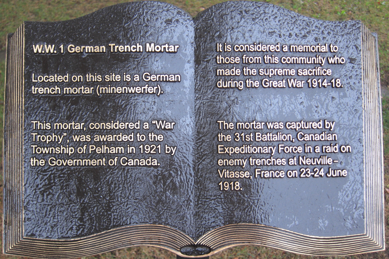 Le mortier fut attribué au canton de Pelham en 1921 par le gouvernement du Canada et placé à côté du cénotaphe de Pelhman. Il s’agissait de l’un des 101 mortiers de tranchée rapportés au Canada et l’un des rares n’ayant pas été fondus pour les efforts de la Seconde Guerre mondiale.