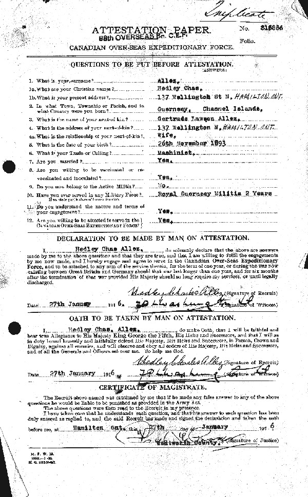 Fils de George H. Allez et Elizabeth (Heaume) Allez de Forest, Guernsey. Il a épousé Gertrude Irene Lawson de Grimsby, Ontario le 25 novembre 1915. Immigré en Ontario en 1912.