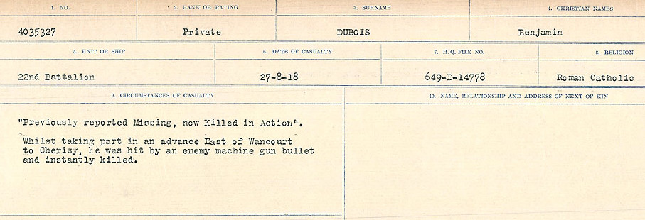 Baptisé Émile-Benjamin Dubois. Fils de François-Xavier Dubois (décédé 1899) et Émilie Lavoie, de Montréal (Ste-Cunégonde), Québec; elle en était à son deuxième veuvage et ne s’est jamais remariée. Benjamin avait déclaré être né le 13 lors de son enrôlement.