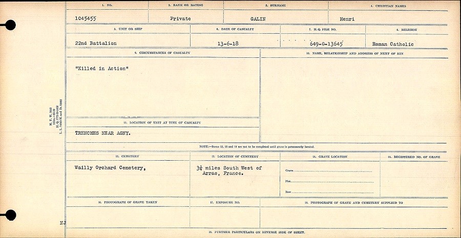 Le bataillon était en support de brigade au sud-est d’Agny et envoyait des corvées pour améliorer les tranchées de Telegraph Hill Switch, près de Neuville-Vitasse. Henri a été tué alors qu’il participait à une de ces corvées. Son prénom est épelé « Henry » dans le Livre du Souvenir de la Première Guerre mondiale.