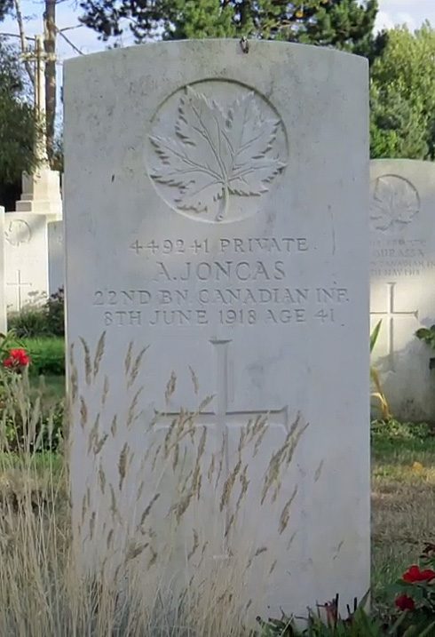 Baptisé André-Napoléon Joncas. Fils d’André Joncas (décédé 1908) et Annie Chiasson, de Grande-Rivière, Gaspésie, Québec. Il avait déclaré être né en 1883 lors de son enrôlement.