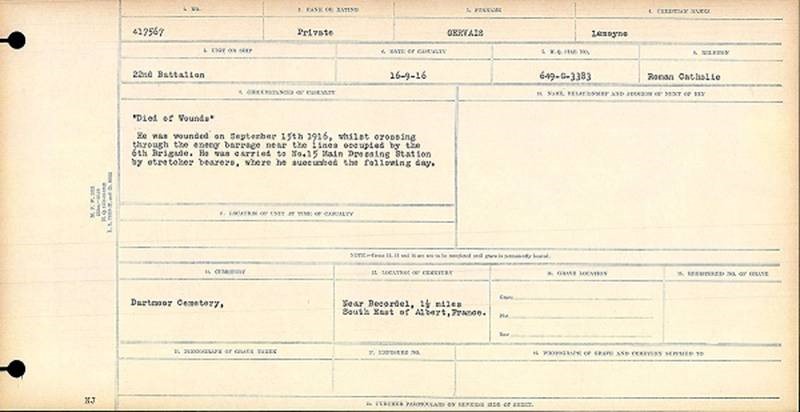 Lemoyne a été blessé grièvement le 15 septembre 1916 à Courcelette et il est mort de ses blessures le lendemain au Poste de secours n° 15 installé près d’Albert.