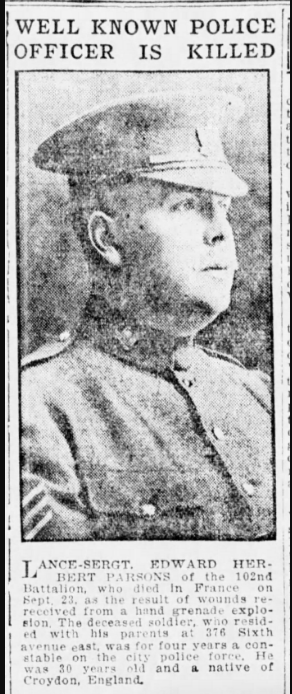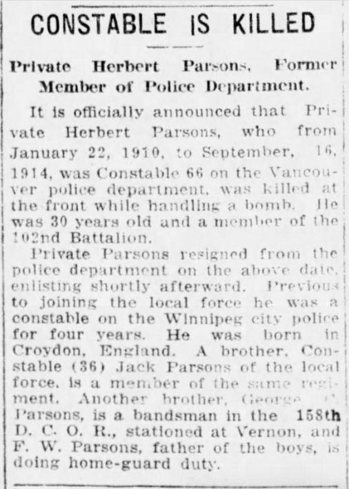 Fils de George Charles et Harriet Matilda Parsons, de 376, 6th Avenue East, Vancouver, Colombie-Britannique.