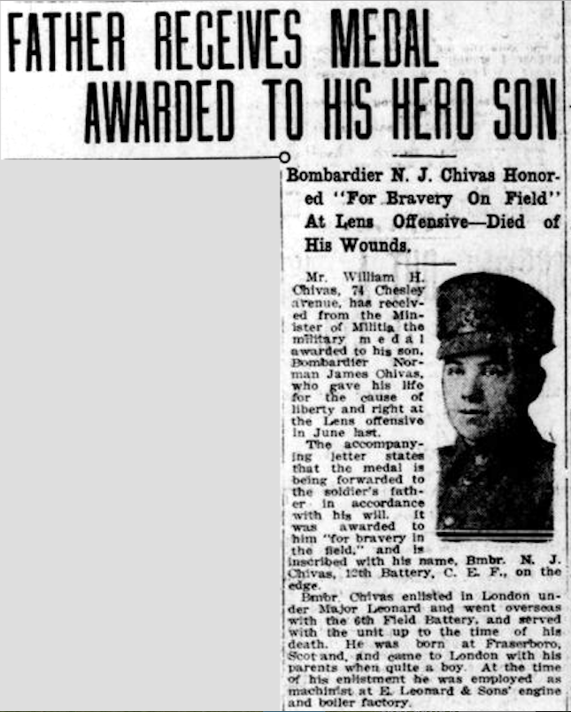 Frère du soldat Edwin John Chivas, décédé au service du Canadian Infantry (Central Ontario Regiment).