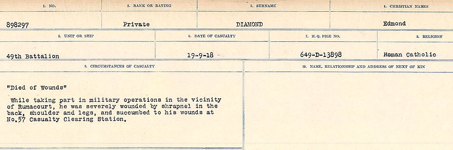Fils de Adonias Diamond et Ulalie Bourrassa, son épouse, de St. Bernabie, Conte, St. Maurice, Québec; époux de Leodia Diamond (née Lemire) de St. Valere, Bulstrode, Québec.