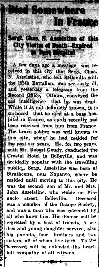Fils de John et Susan Asselstine. Époux de C. N. Asselstine, de Belleville, Ontario.