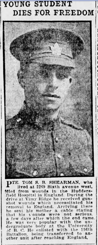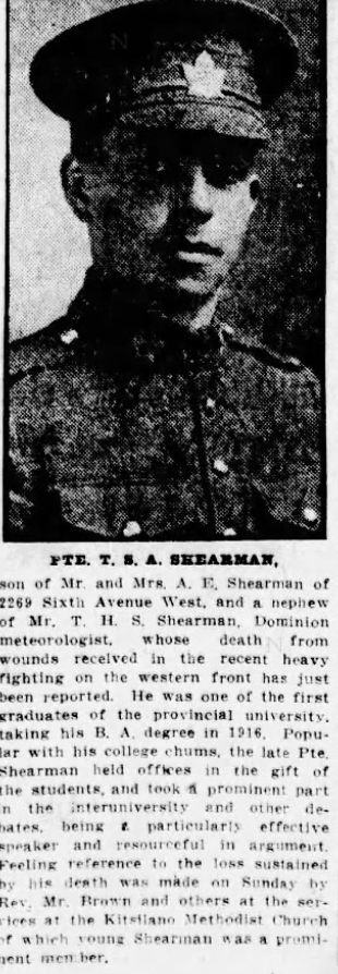Fils de Arthur Evans Shearman et Lottie Shearman, de 2269, 6th Avenue West, Vancouver, Colombie-Britannique. B.A. Graduated from the University de Colombie-Britannique.