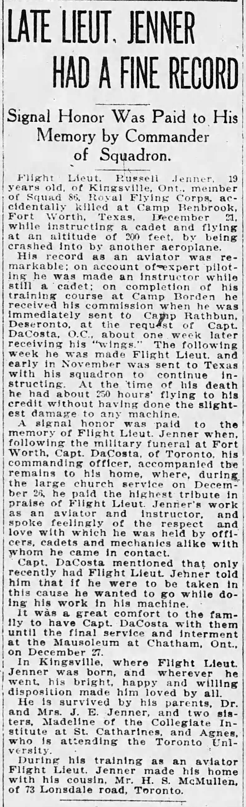 Fils de John Earl Jenner et Ella E. Jenner de Kingsville, Ontario.