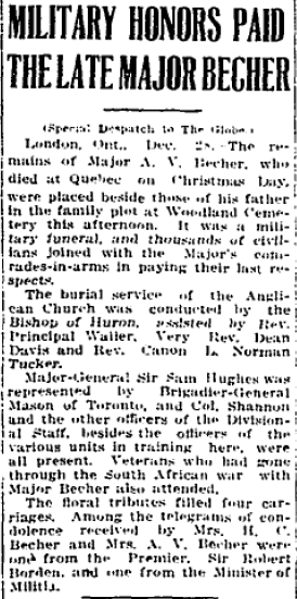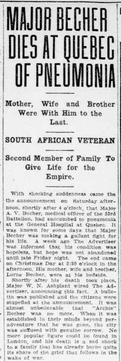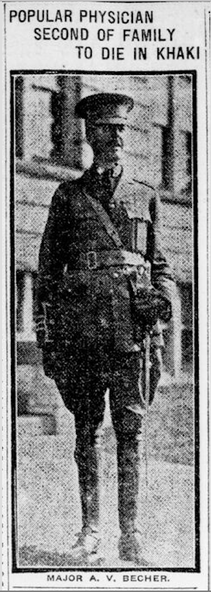 Fils de Katherine Moore et Henry Becher de London, (Ontario). Époux de Flora Adine (née Wilson) Becher et père de John Campbell et Archibald Alexander Cameron, de Thornwood, London, (Ontario). Frère de Lorne et du major Henry Campbell Becher, tué au combat le 15 juin 1915.