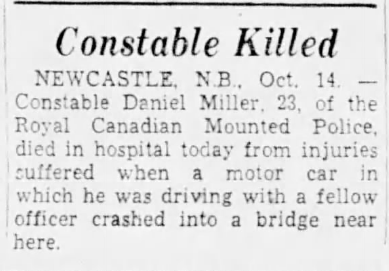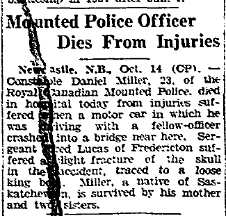 Le gend. Miller était fermier et charretier avant de s’enrôler dans la Gendarmerie à Regina. Il a été le premier membre qui a péri dans un accident automobile. L’enquête a conclu que la cause de l’accident était le bris d’une biellette de direction qui a fait perdre la maîtrise du véhicule. Le gend. Miller est enterré à Wapella (Saskatchewan).