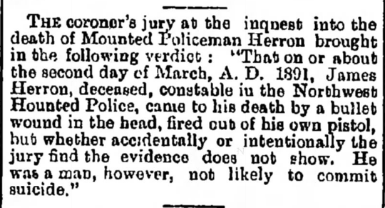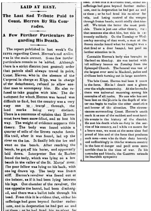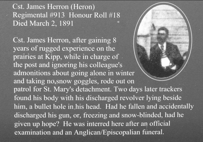 Le gendarme Herron était originaire de l’Irlande et avait déjà travaillé comme ouvrier agricole. Il a été promu caporal le 13 juin 1888 et a été libéré le 25 juillet 1889 à la fin de son service. Il s’est réenrôlé à titre de gendarme en avril 1890. Il est décédé en patrouille dans un blizzard, près de la rivière St. Mary’s.