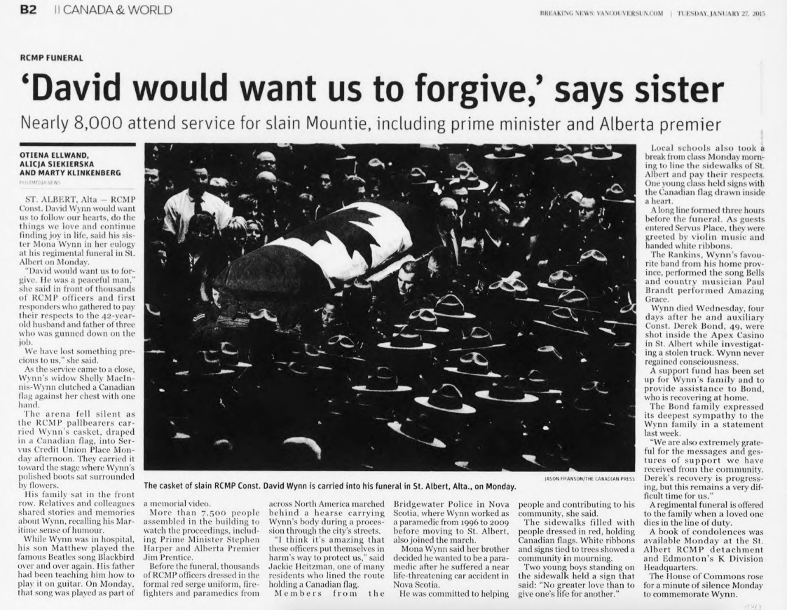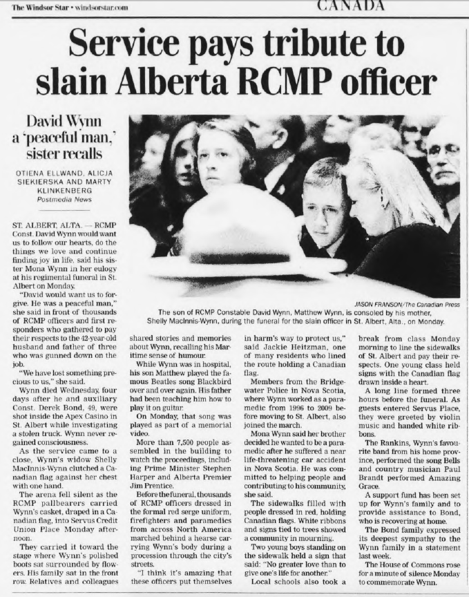 Avant de joindre les rangs de la Gendarmerie, le gend. Wynn a travaillé en tant qu’ambulancier à Bridgewater, en Nouvelle-Écosse. Il adorait une foule d’activités de plein air, comme la plongée en scaphandre autonome, la pêche, le camping, la motoneige et la moto hors route. Tous ceux qui connaissaient le gend. Wynn le décrivent comme un homme fiable et sympathique qui aimait faire des blagues et jouer des tours.