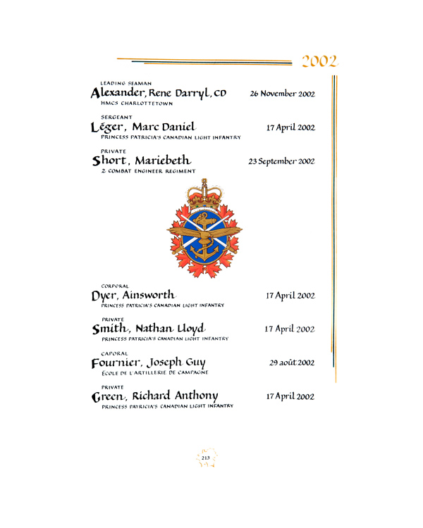 Page 213 du Livre du Souvenir de la Au service du Canada, Vol. I (1947 – 2014).