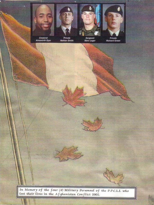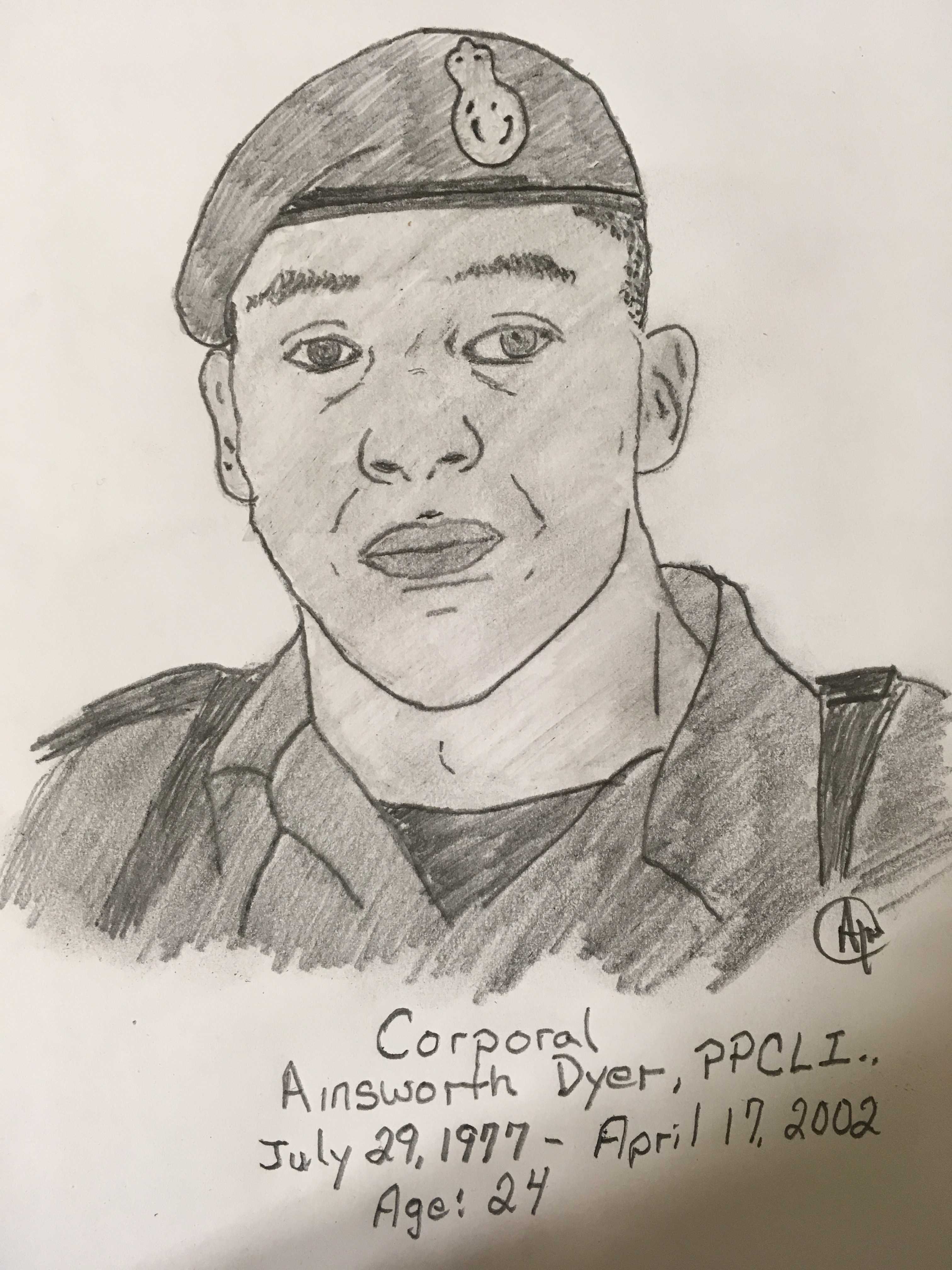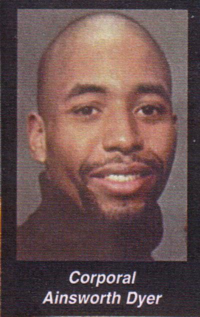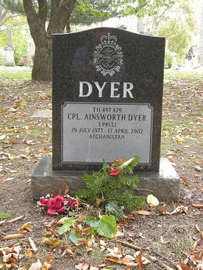 Fils de feu Paulet Agatha (née Dawkins) Dyer (La Mère de la Croix du Souvenir (Croix d’argent) de 2004) de St. Laurent, Québec. Frère de Carolyn. Il s'enrôla dans le Régiment 48th Highlanders de la Milice du Canada comme fantassin, en février 1996, et transféra à la Force régulière en 1997. Après avoir complété l'École de Combat, Caporal Dyer fut muté au 3ième Bataillon, Princess Patricia's Canadian Light Infantry (PPCLI) au printemps de 1998, où il servait comme fusilier. Il a déployé avec le 3ième Bataillon, PPCLI, dans le cadre de l'Opération Palladium en Bosnie-Herzégovine, en 2000. Plus tard il a déployé avec son bataillon dans le cadre de l'Opération Apollo, en Afghanistan, où il fut tué durant un exercice de tir réel. Une plaque commémorant le sergent Marc Léger, le caporal Ainsworth Dyer, le soldat Richard Green et le soldat Nathan Smith repose sur un monument commémoratif éclairé, à côté du poste de commandement situé au terrain d'aviation de Kandahar, en Afghanistan. Le caporal Dyer était commémoré en février 2003 sur le Rakkasan Memorial Wall à Fort Campbell, Kentucky. Le caporal Dyer est décédé suite à un tir ami le 17 avril 2002, lors de son service en Afghanistan.