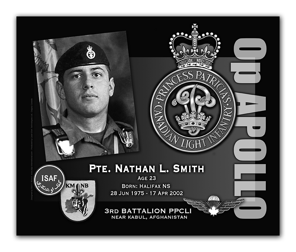 Le Soldat Smith a reçu la Médaille de la Camaraderie de la Légion royale canadienne à la fin de son entrainement de base. Il a également gradué comme le meilleur étudiant de sa classe à l’École de combat de Wainwright, en Alberta, avant d’être muté à cette unité. En décembre 1998, il se fiançait à Jodi Carter.