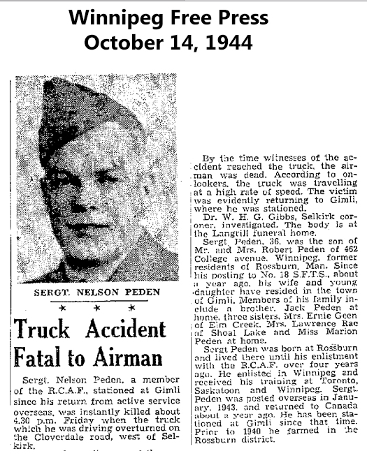 Fils de Robert et Marion W. Peden, de Rossburn, Manitoba. Époux de Viola Peden, de Gimli, Manitoba.