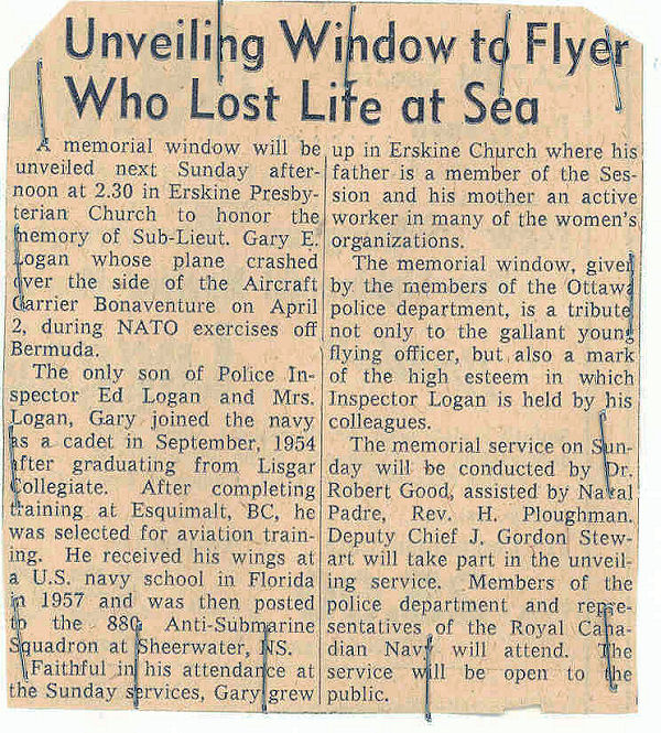 Fils de John Edward et Maybelle Gladys Logan d'Ottawa, Ontario. Frère de Peggy Logan. Une fenêtre commémorative a été dévoilée le 21 juin 1959, à l'église presbytérienne Erskine, pour honorer la mémoire du sous-lieutenant Gary Edward Logan, qui périt le 2 avril 1959,lorsque son avion s'écrasa contre le côté du porte-avions Bonaventure. La fenêtre commémorative, qui a été offerte par les membres du service de police d'Ottawa, rend hommage à la bravoure du jeune lieutenant d'aviation et témoigne de la haute estime que les collègues de l'inspecteur Logan, le père du sous-lieutenant Logan, ont pour lui.