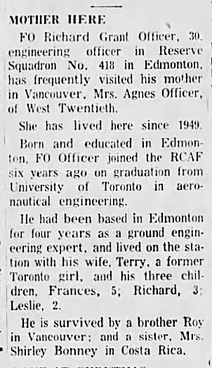 Fils de feu d'Ernest et Agnes Mary (née Lewis) Officer de Vancouver, Colombie-Britannique. Époux de Theresa (née Repas) Officer et père de Frances, Richard et Leslie Officer de Richmond Hill, Ontario. Frère d'Ernest et Shirley Officer.