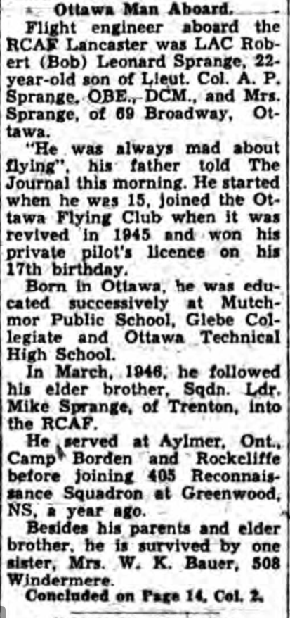 Fils de Lt. Col Arthur Philip et Ethel May (née Jones) Sprange d'Ottawa, Ontario. Frère de Samuel et Gertrude Sprange.