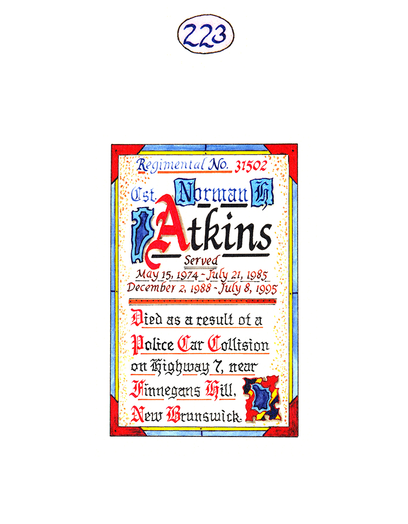 Le gend. Atkins a servi en Colombie-Britannique et au Nouveau-Brunswick. Il adorait la patrouille routière. Il est décédé à la suite d'un accident impliquant une voiture de police sur la route 7, près de Finnegans Hill, comté de Queens, Nouveau-Brunswick.